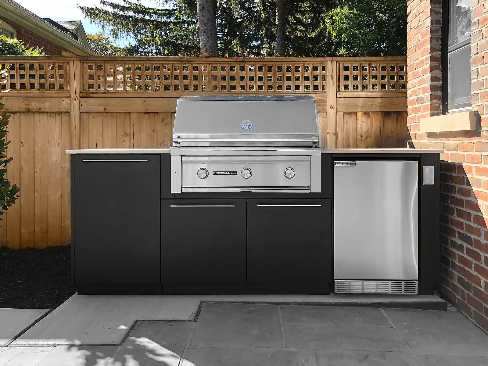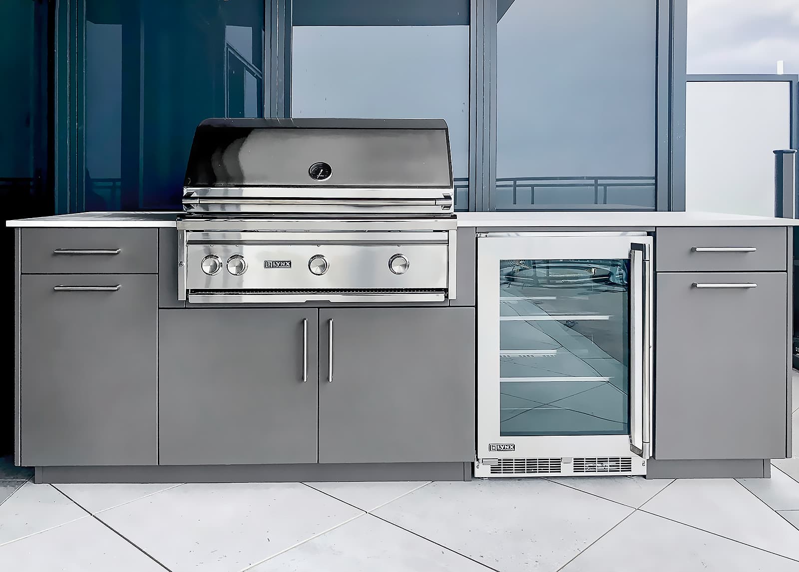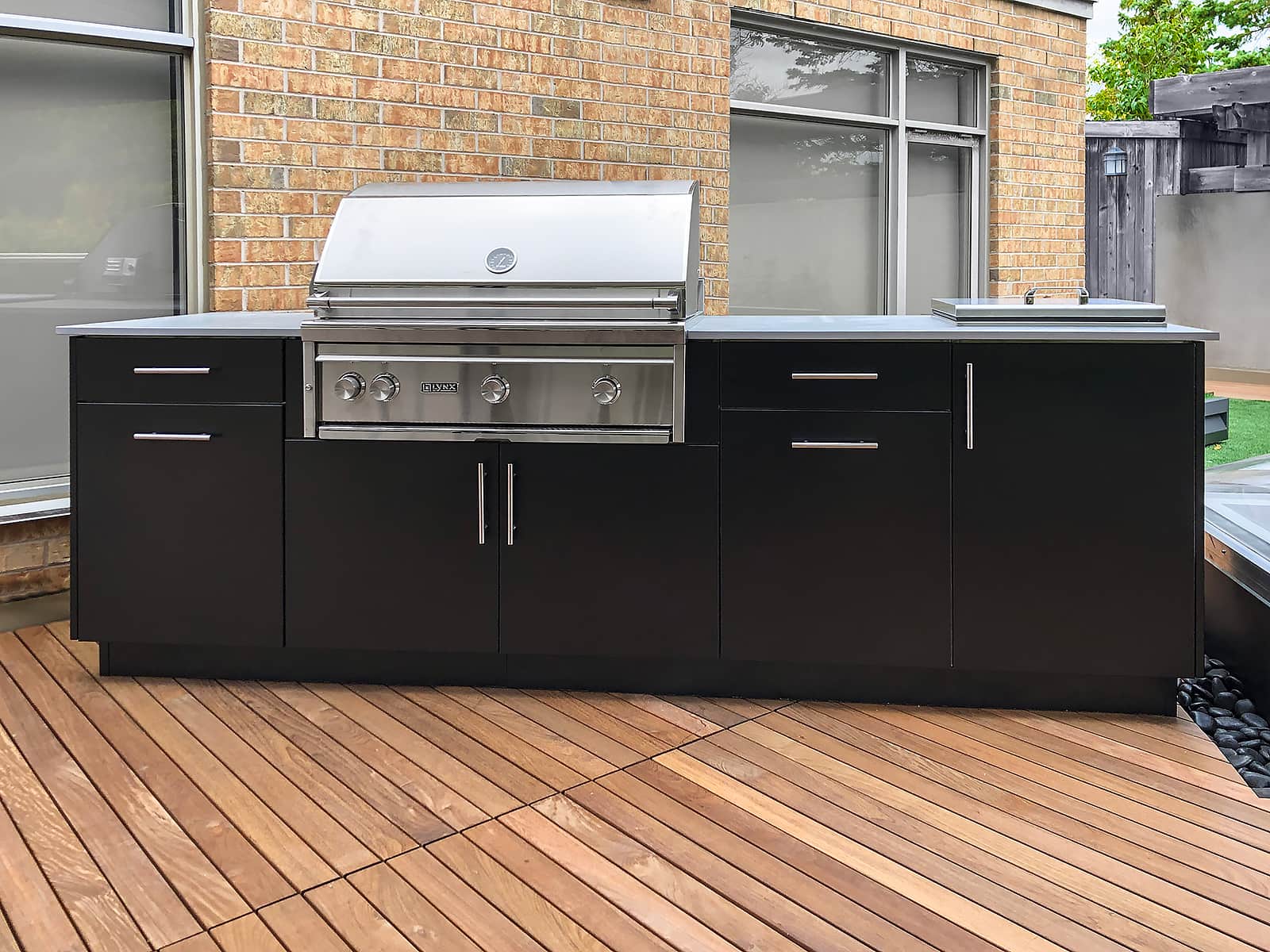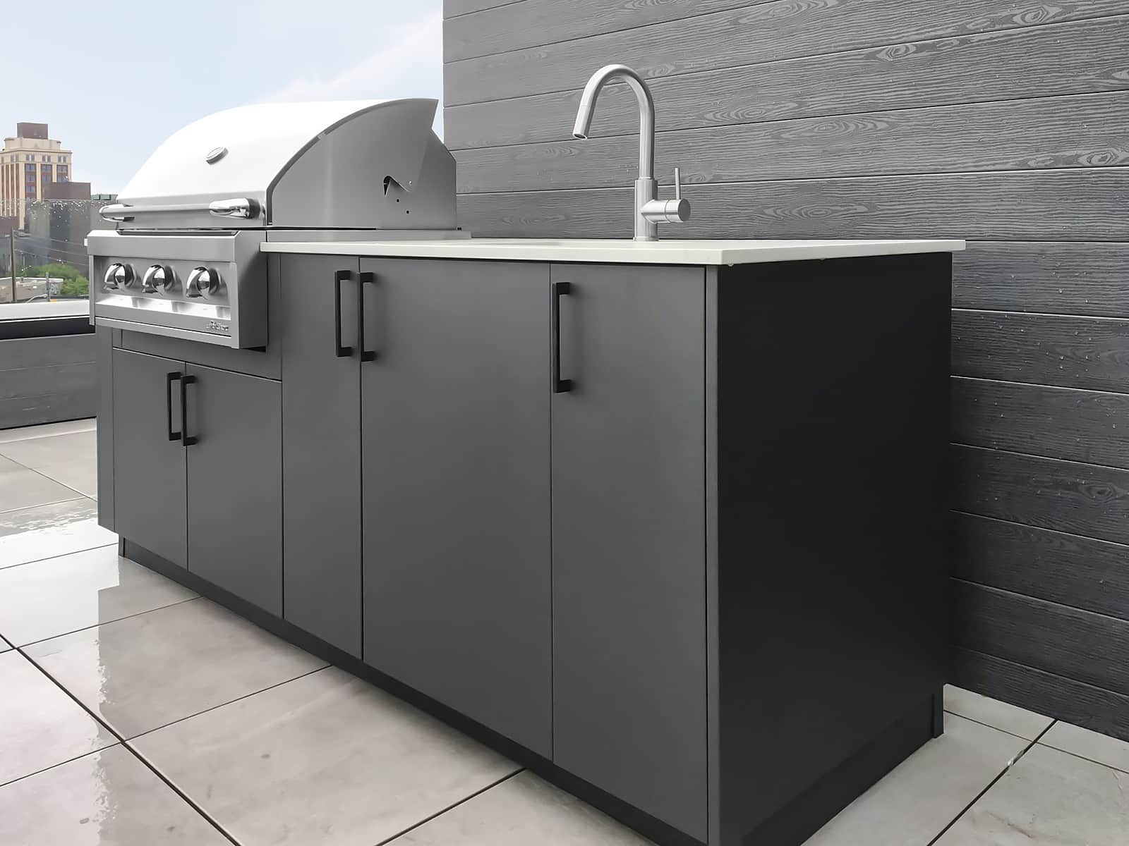 Alumina cabinetry (graphite finish), forge handles (dark bronze), Blaze grill, double side burner, Dekton Keon countertop.